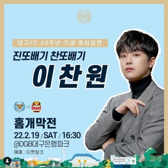 10일 대구 FC 공식 인스타그램 계정에는 "OFFICIAL : '대구의 자랑' 이찬원 대구 FC 홈 개막전 영입! 대구 FC 창단 20주년을 기념하는 홈 개막전 축하공연을 위해 대구의 자랑! 진또배기, 찬또배기, 트로트 가수 이찬원이 대팍에 옵니다! 19일 토요일 대팍에서 함께해요! #20주년기념 #이찬원 #대구의자랑 #승리요정 #대구라는자부심 #대구FC #DAEGUFC #WEAREDAEGU #2022 #홈경기 #DGB대구은행파크"라는 글이 게재되었다.