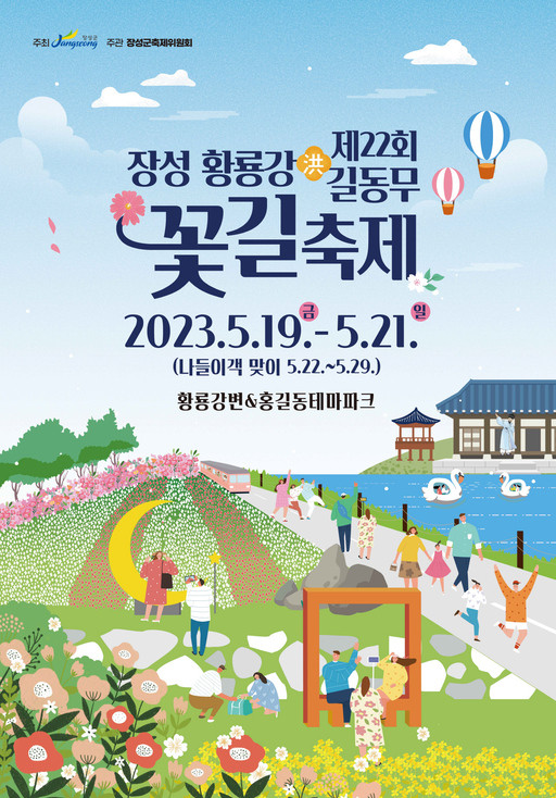 '장성 황룡강 洪(홍)길동무 꽃길축제'는 20년 전통의 홍길동 축제에 황룡강 봄꽃을 더한 장성의 대표 봄 축제다. 꽃이나 야경 감상, 공연 관람은 황룡강에서, 아이들 프로그램은 홍길동 테마파크에서 체험한다.