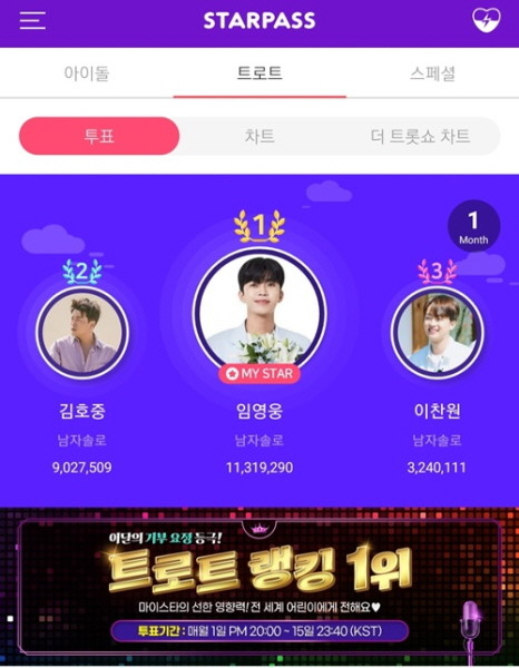 지난 스타패스앱이 발표한 '이달의 기부요정 트로트 랭킹' 설문 결과에서 임영웅이 1131만 9290표를 득표해 1위에 올랐다.